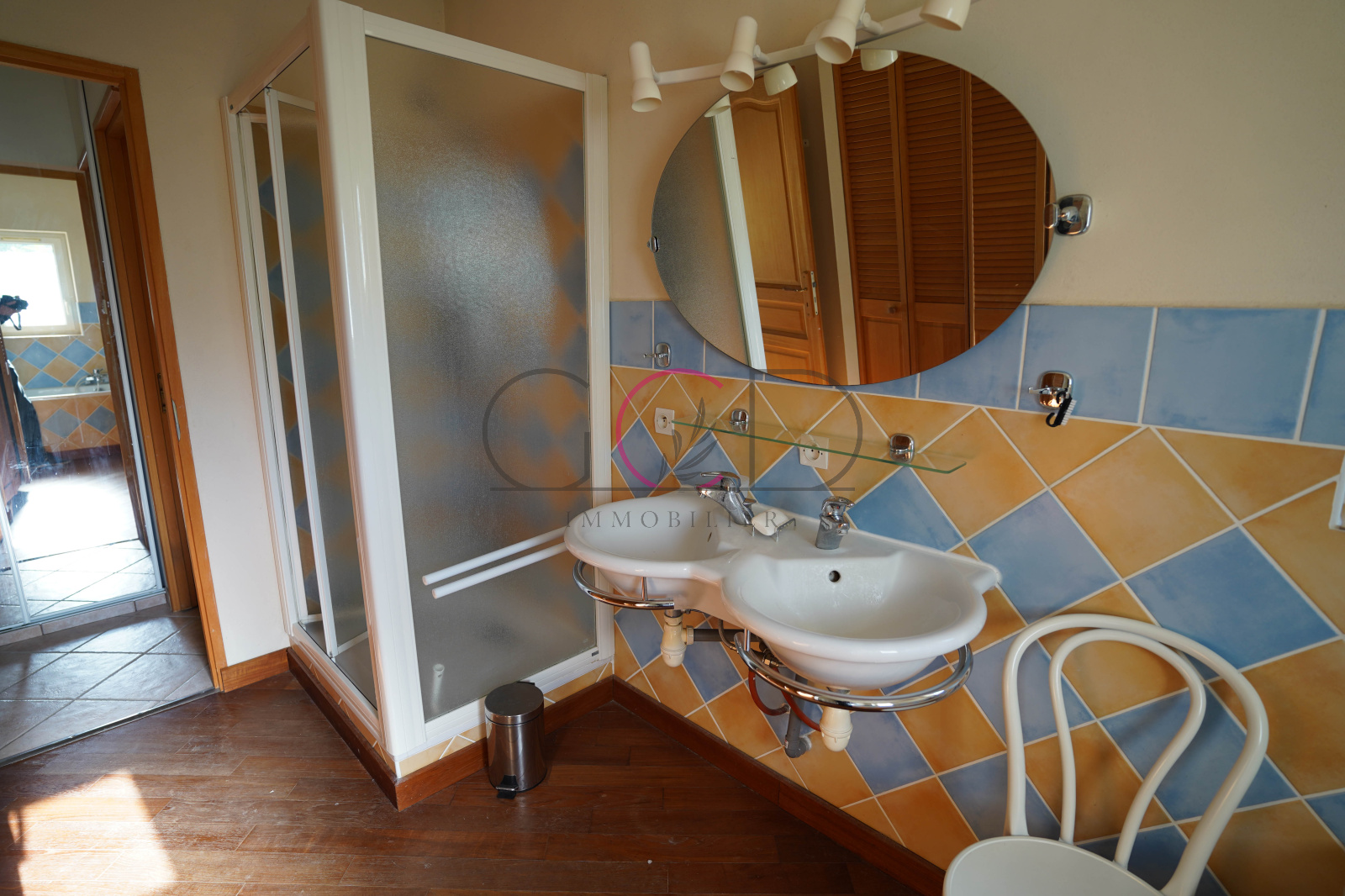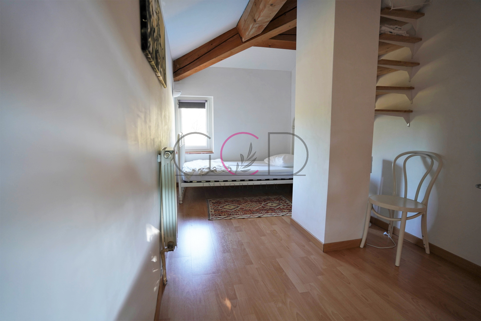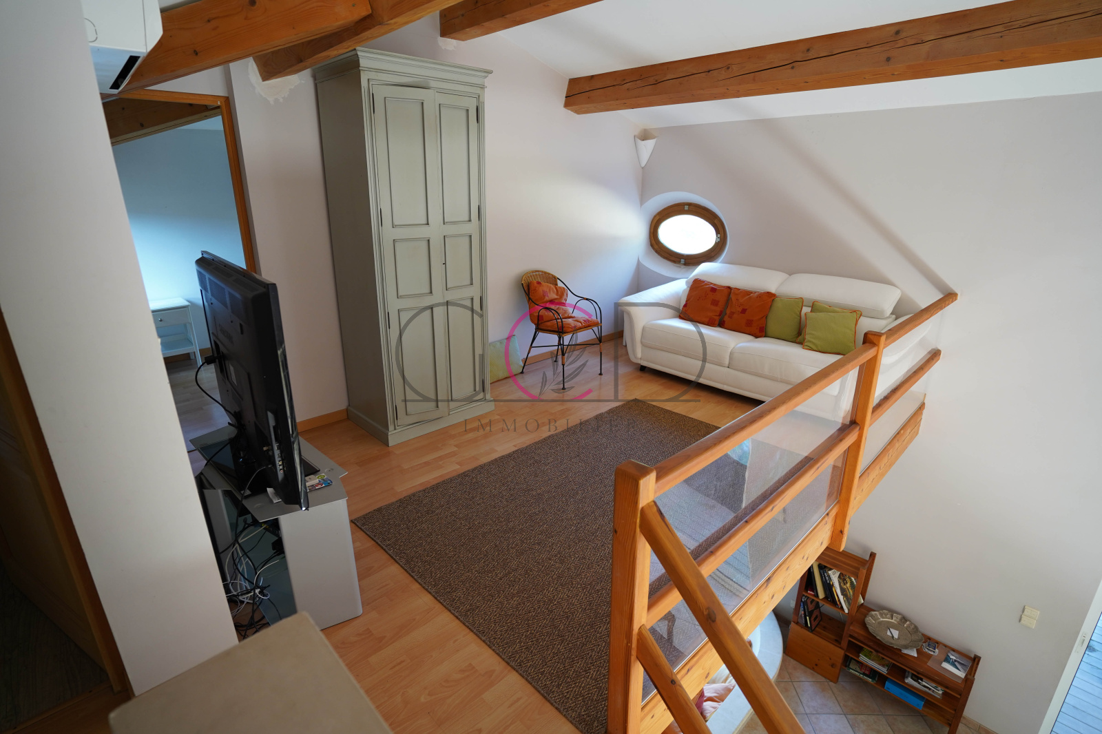 A l'étage, une mezzanine climatisée de 12.6m² domine le salon et mène à 3 chambres de 10.3m², 12.2m² et 9.6m² avec rangements ainsi qu'une salle d'eau avec WC de 3.6m².