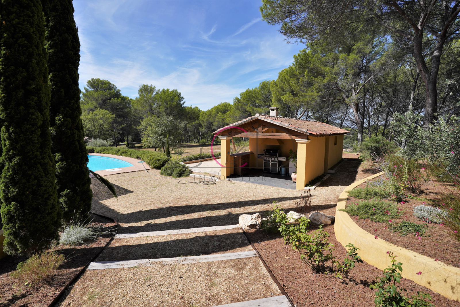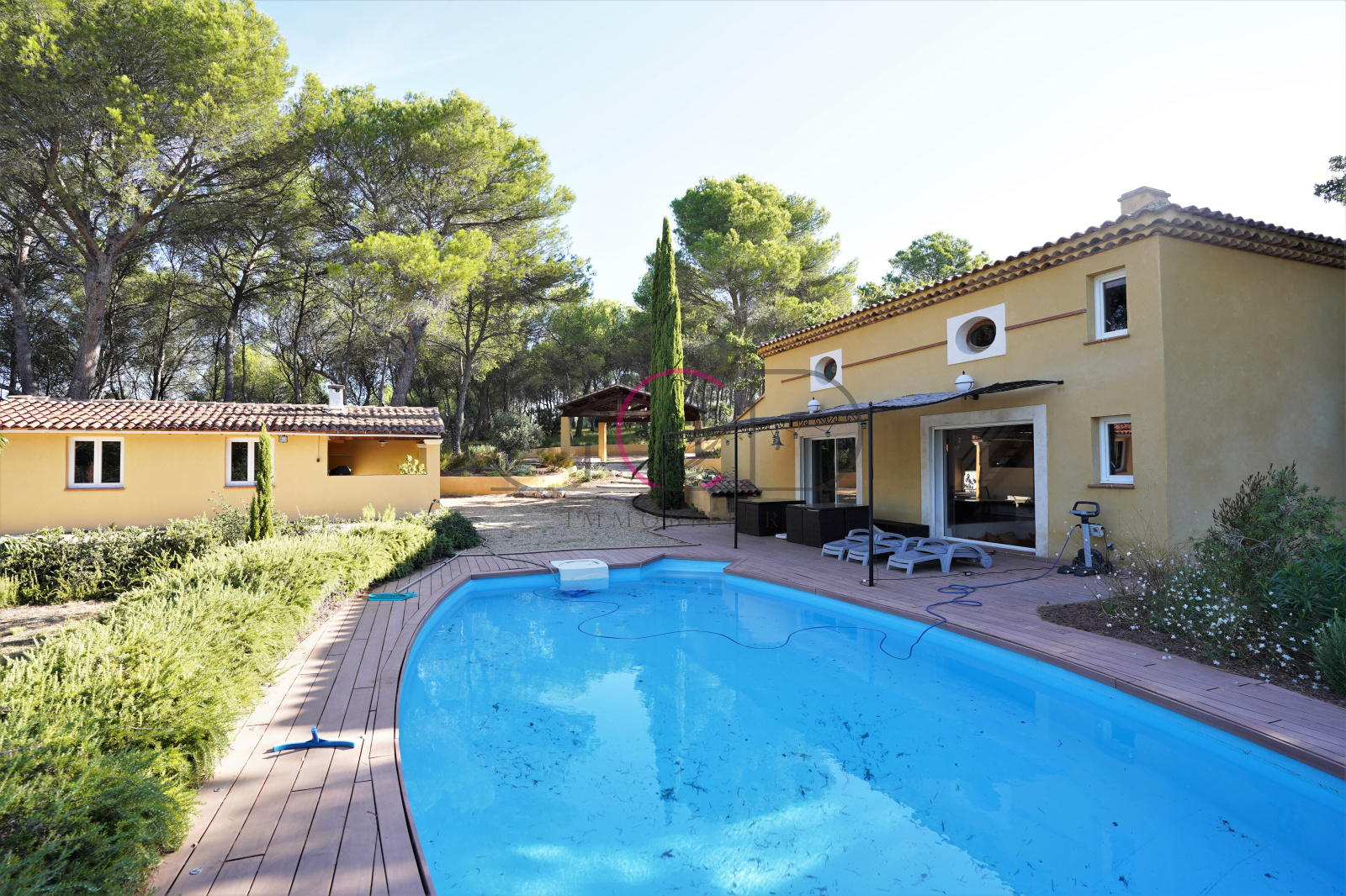 Le magnifique jardin arboré de 2800m² sans vis-à-vis et en pleine nature dans la pinède comporte une grande terrasse spacieuse en bois donnant sur une piscine 10x5m, un boulodrome, un carport, et un poolhouse (espace de stockage réservé au stockage du propriétaire). Possibilités de garer plusieurs voitures à l'ombre sur la parcelle sans impact visuel depuis le jardin.