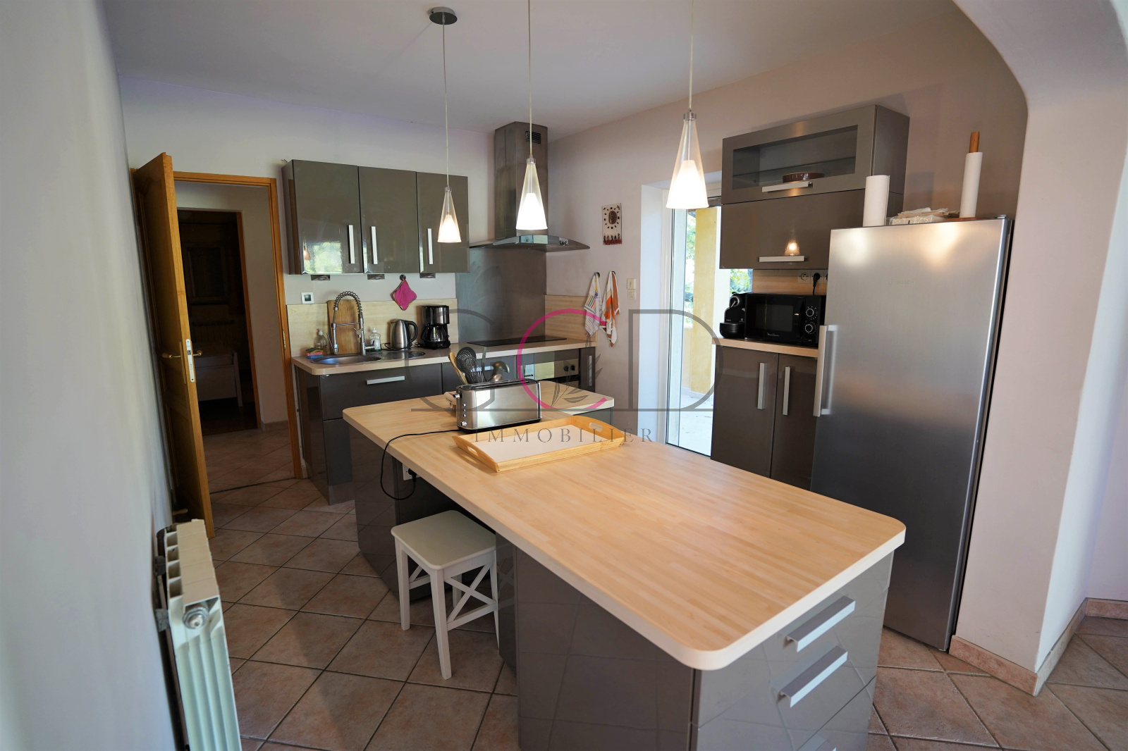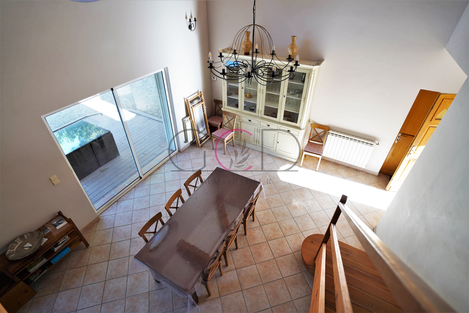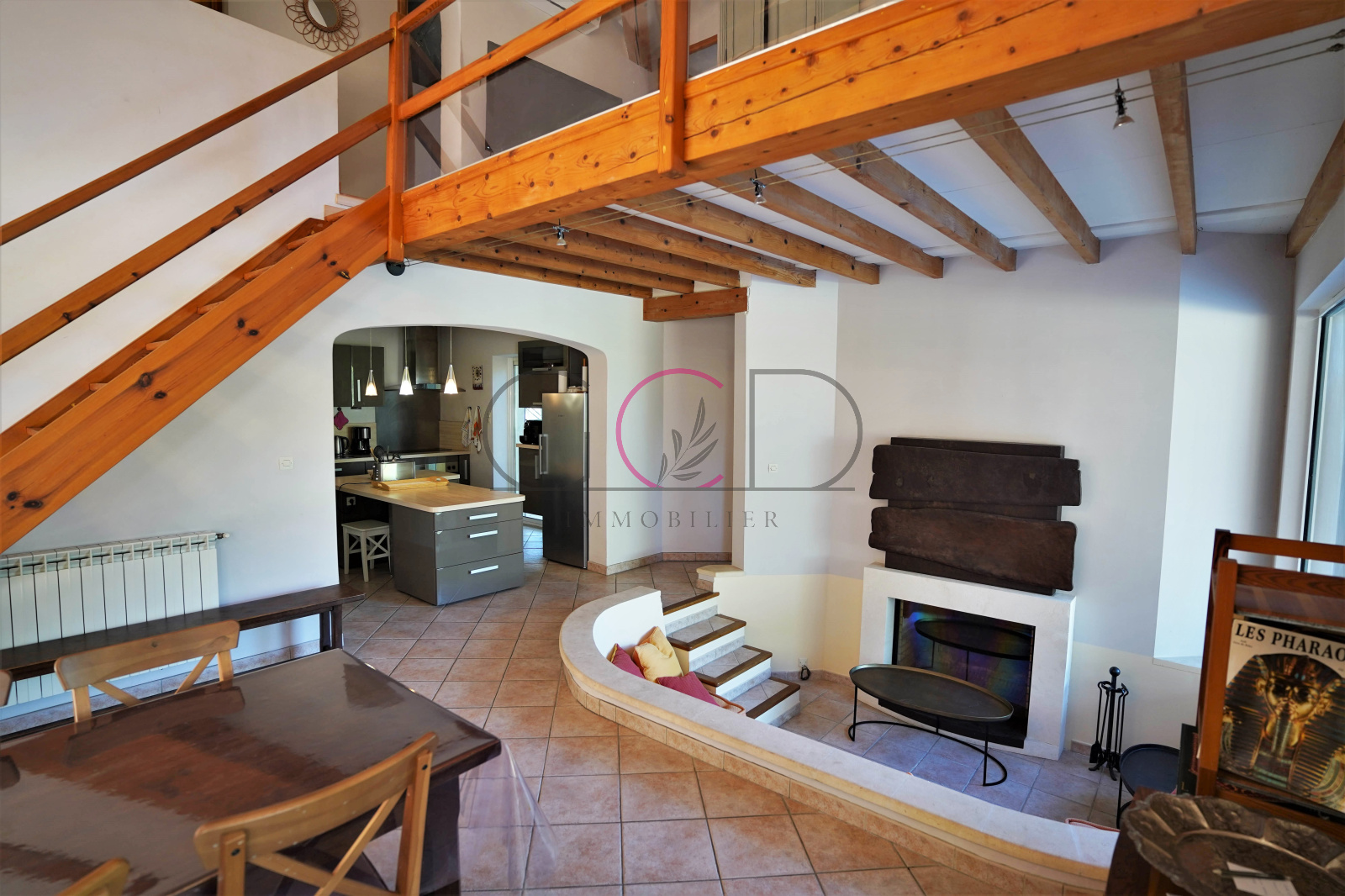 Une salle à manger lumineuse avec de beaux volumes de 36m² donne sur un coin séjour avec cheminée en contrebas et une belle hauteur sous plafond donnant sur une cuisine toute équipée de 10m², une buanderie de 6m² (lave-linge, sèche-linge, table et fer à repasser, congélateur)