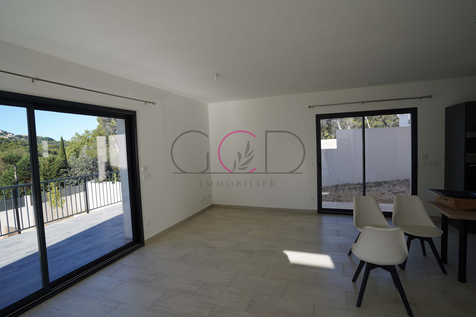 Au dessus du garage, en rez-de-jardin, une pièce de vie avec grandes baies vitrées et cuisine ouverte s'ouvre sur une grande terrasse. Vous trouverez également un cellier, une chambre/bureau de 9m², et une salle d'eau avec WC.
