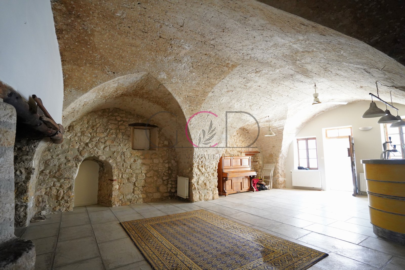 Cette maison T4 de 121m² possède une pièce de vie voutée d'environ 52m² dans laquelle vous pourrez encore voir et utiliser le four banal, avec un piano et un bar. Une petite cuisine de 10m² sur l'arrière mène à une courette privative protégée.