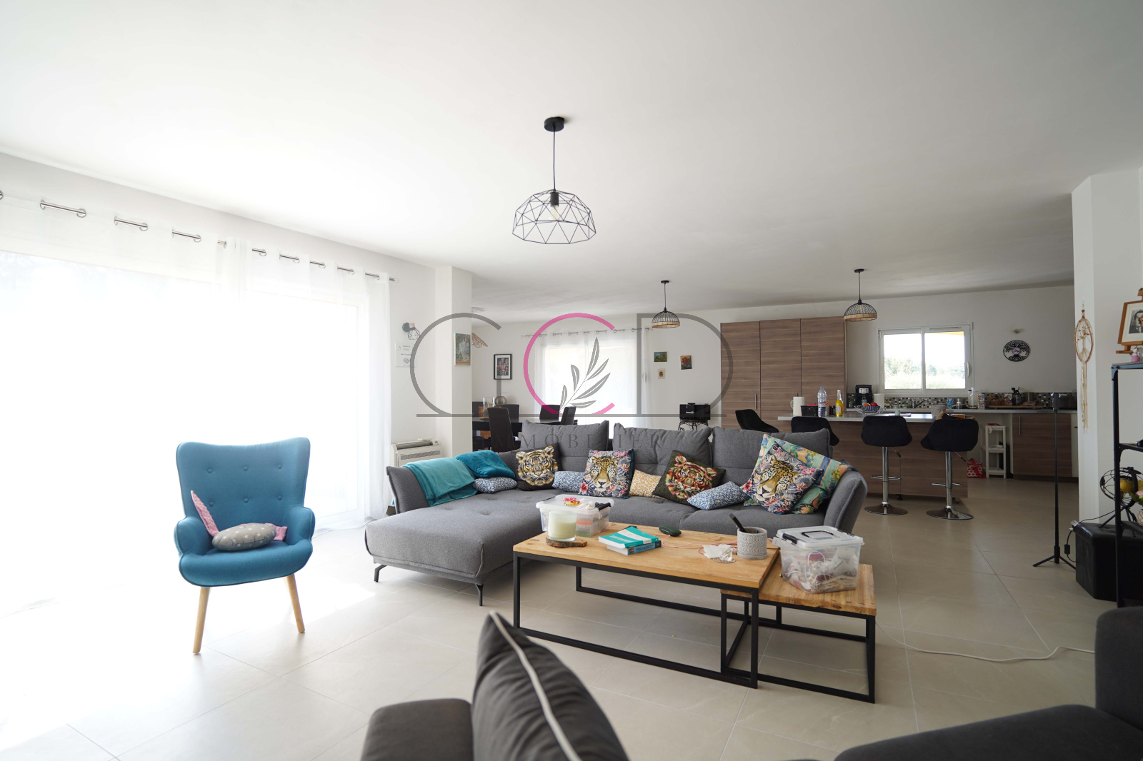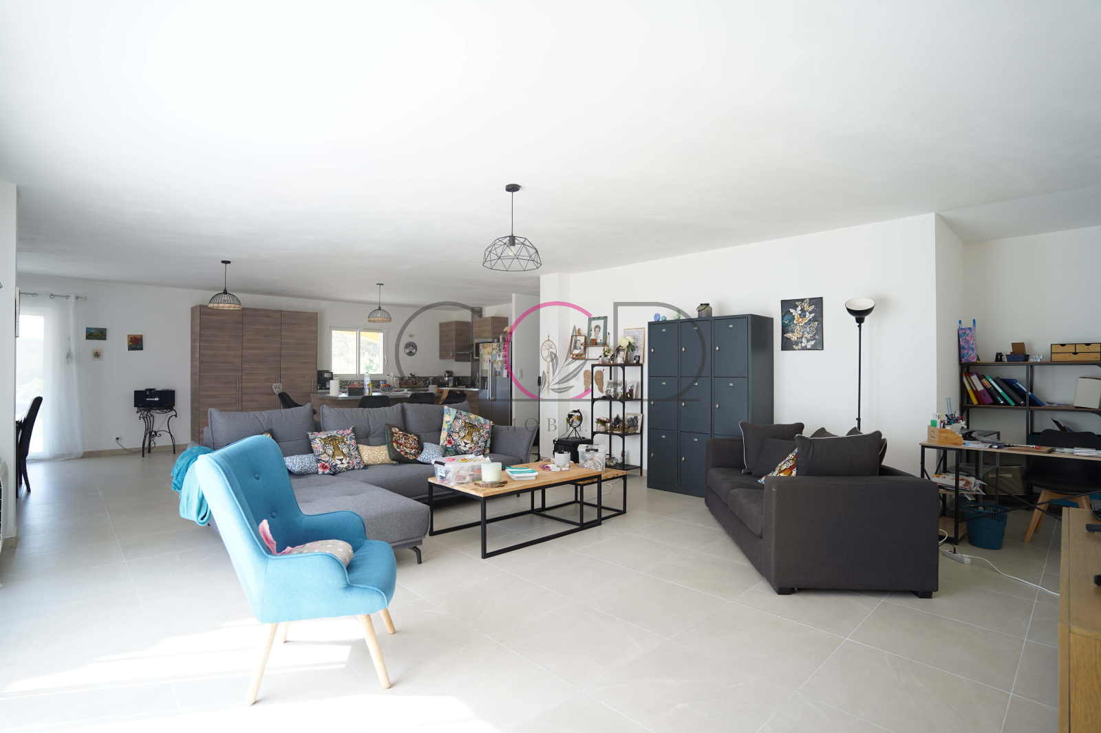 Dès l’entrée, on accède à une vaste pièce de vie de 93 m² intégrant un espace cuisine ouvert, baignée de lumière naturelle grâce à ses larges ouvertures et donnant sur une grande terrasse avec vue dégagée sur le terrain.