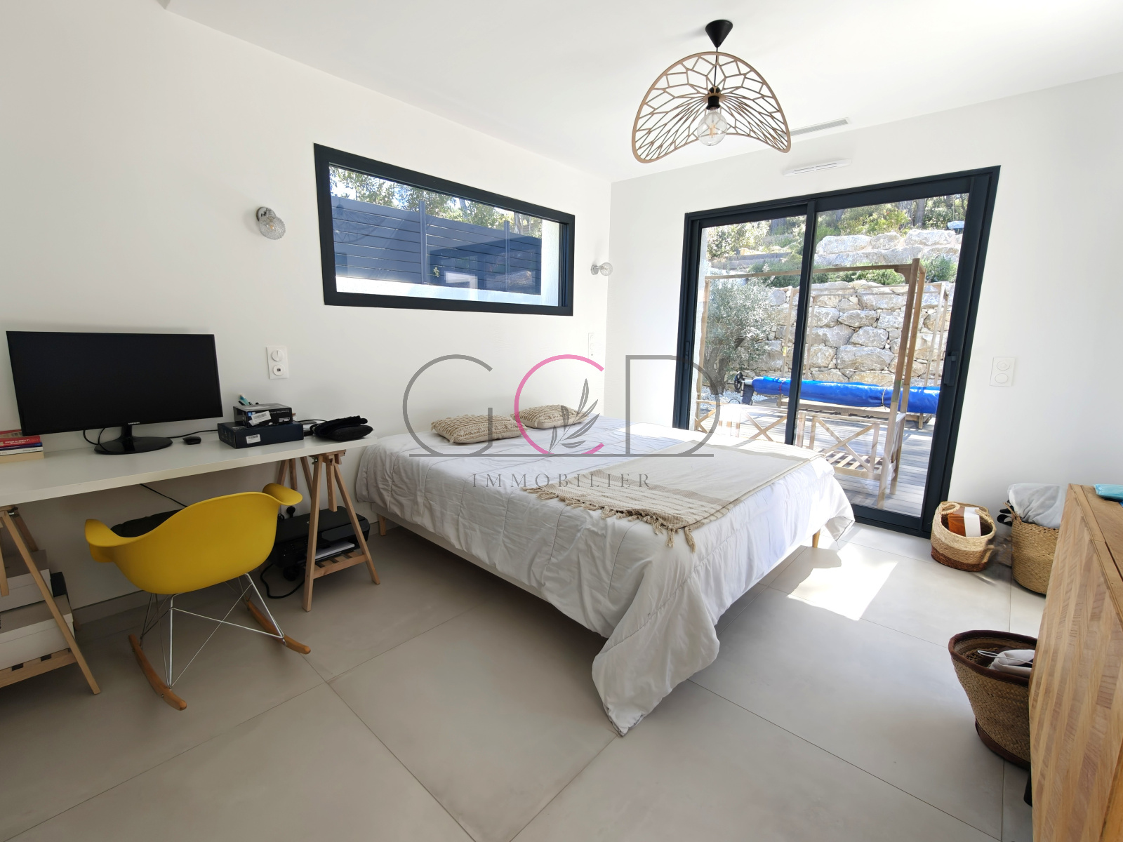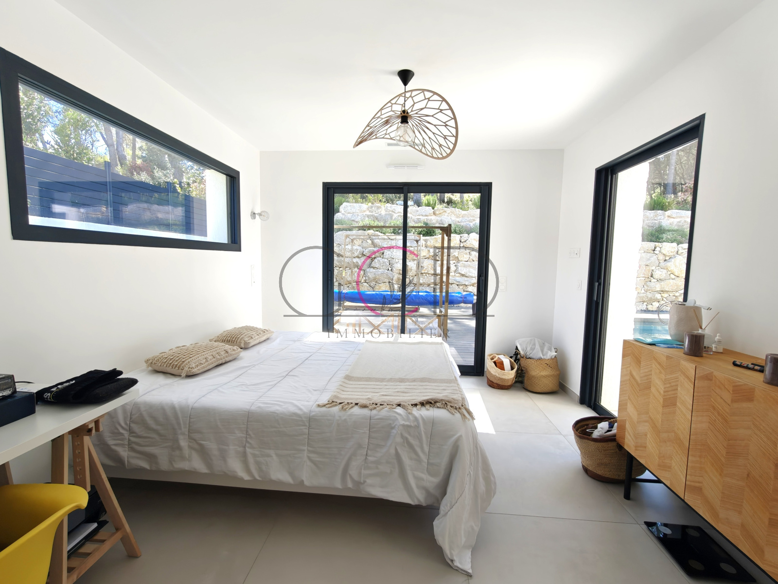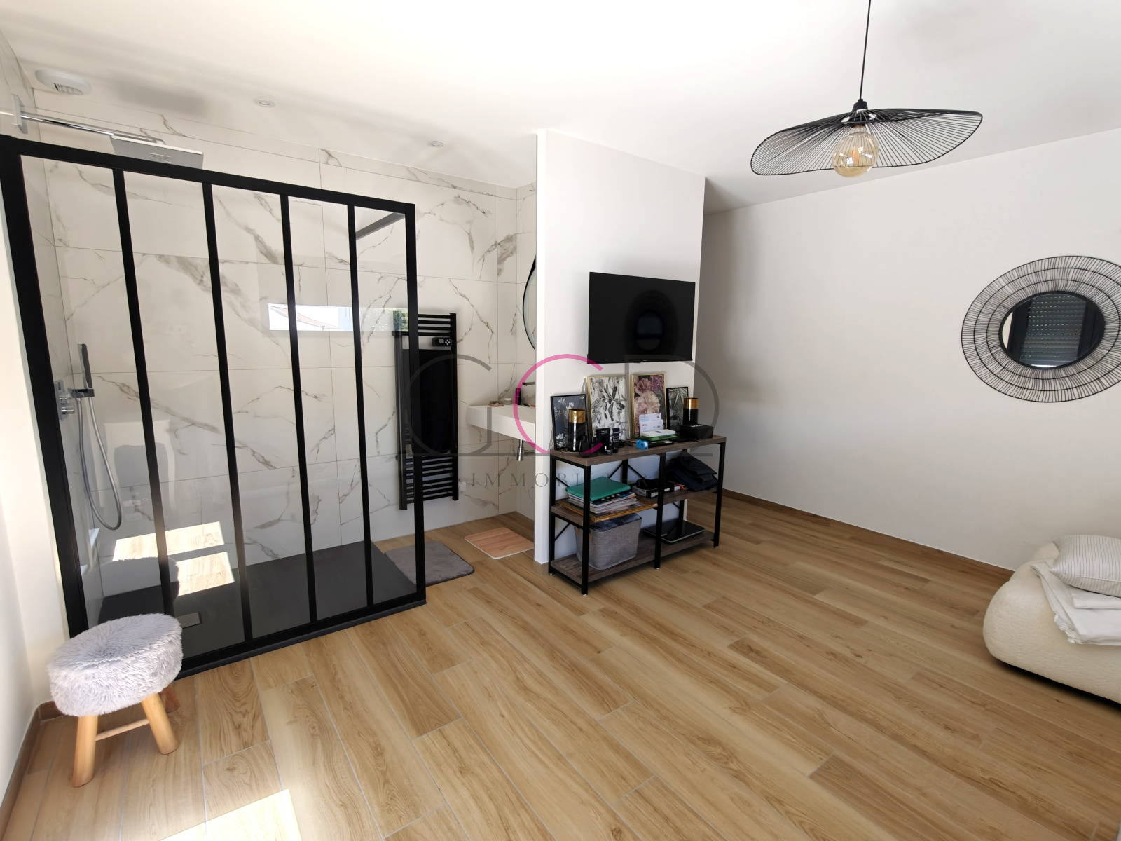 Le rez-de-chaussée propose également une élégante suite parentale d’environ 25 m² avec dressing et salle d’eau, bénéficiant d’un accès direct à la terrasse par deux larges baies vitrées.