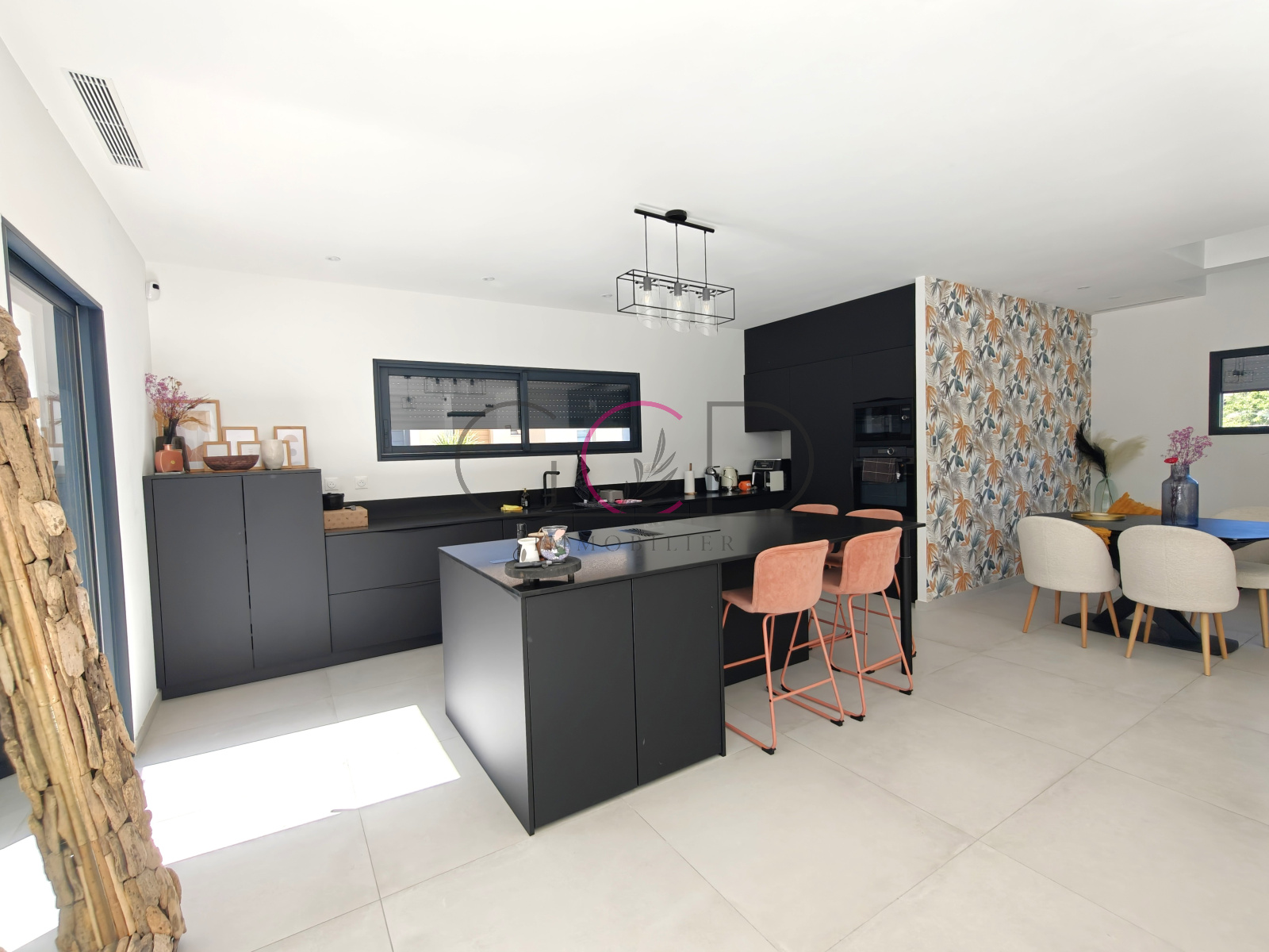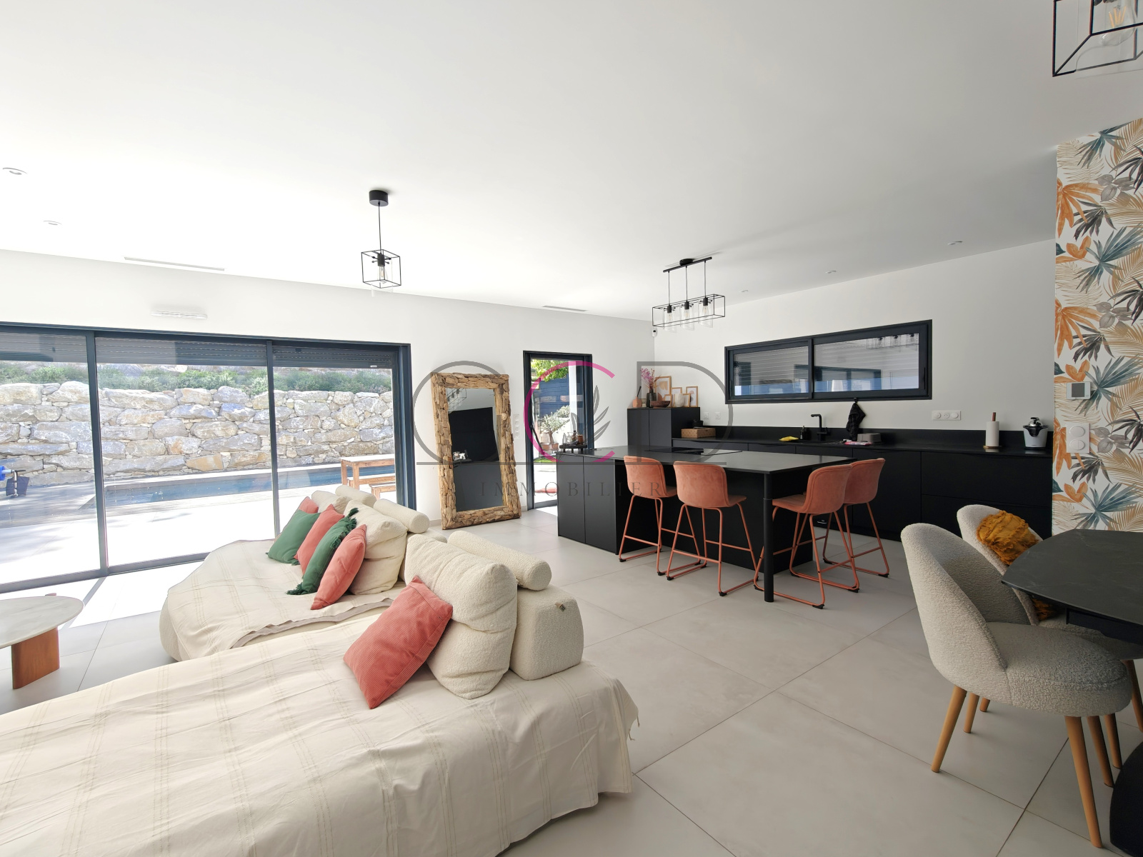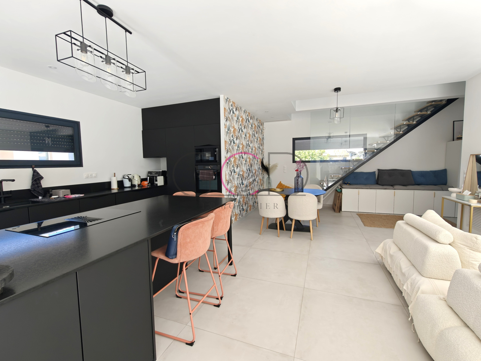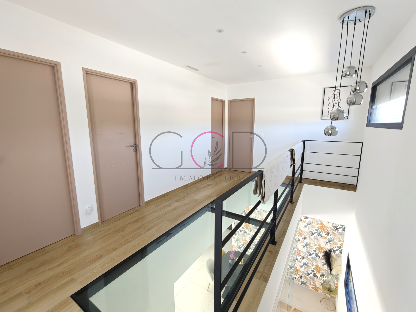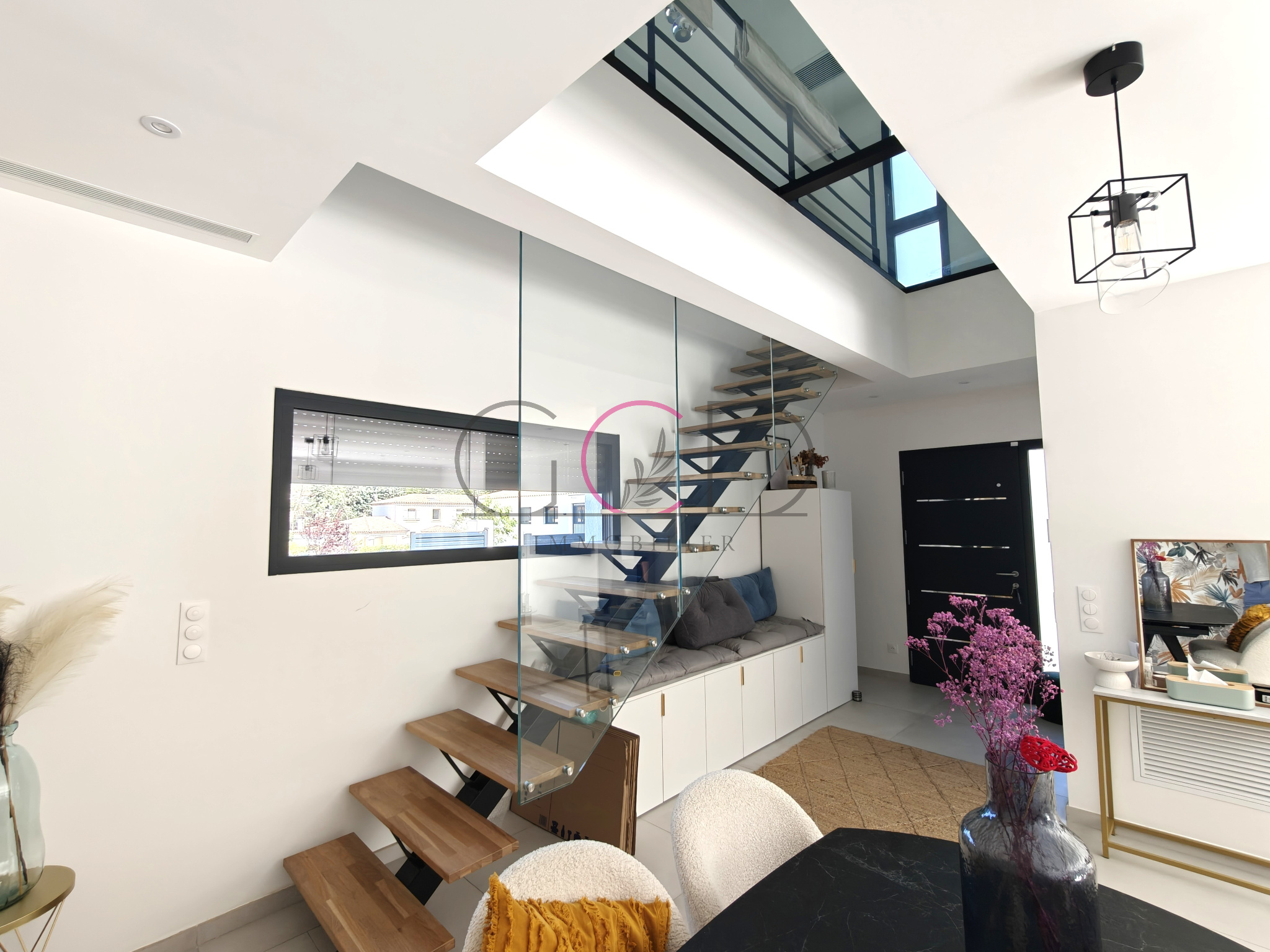 Dès l’entrée, le ton est donné avec un hall spectaculaire ouvert sur le séjour, agrémenté d’un vide sur pièce et d’un plancher vitré apportant une touche architecturale unique. La pièce de vie, spacieuse et lumineuse (près de 58 m²), s’ouvre généreusement sur la terrasse et les extérieurs. La cuisine ouverte, Schmidt, entièrement équipée avec îlot central, allie design et fonctionnalité, complétée par un cellier attenant judicieusement caché.