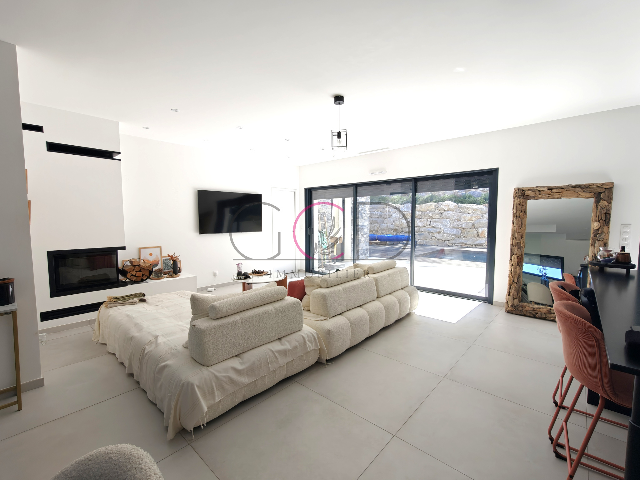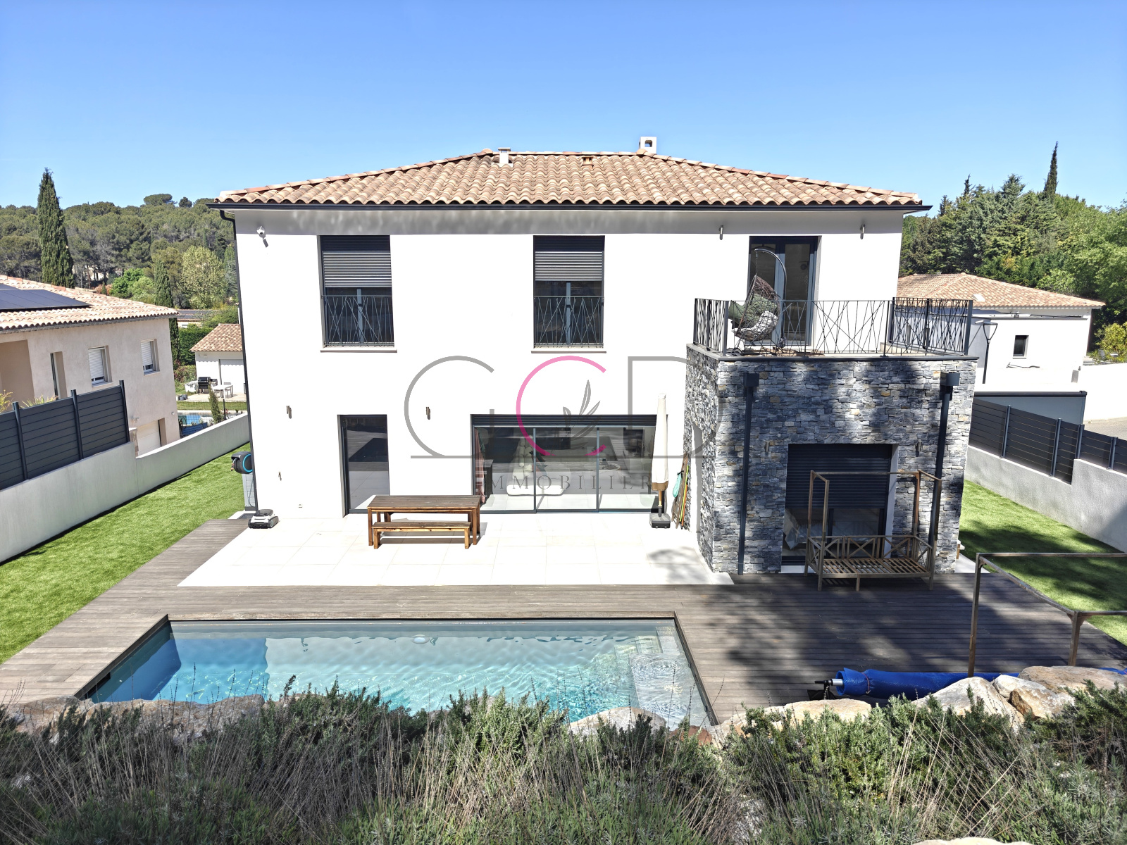 Édifiée par N&C Construction sur un terrain de 1 050 m² exposé plein sud, cette propriété développe 165 m² habitables environ sur 2 étages. Baignée de lumière grâce à ses larges ouvertures et son orientation traversante, elle bénéficie d’un environnement verdoyant dominé par une agréable pinède.