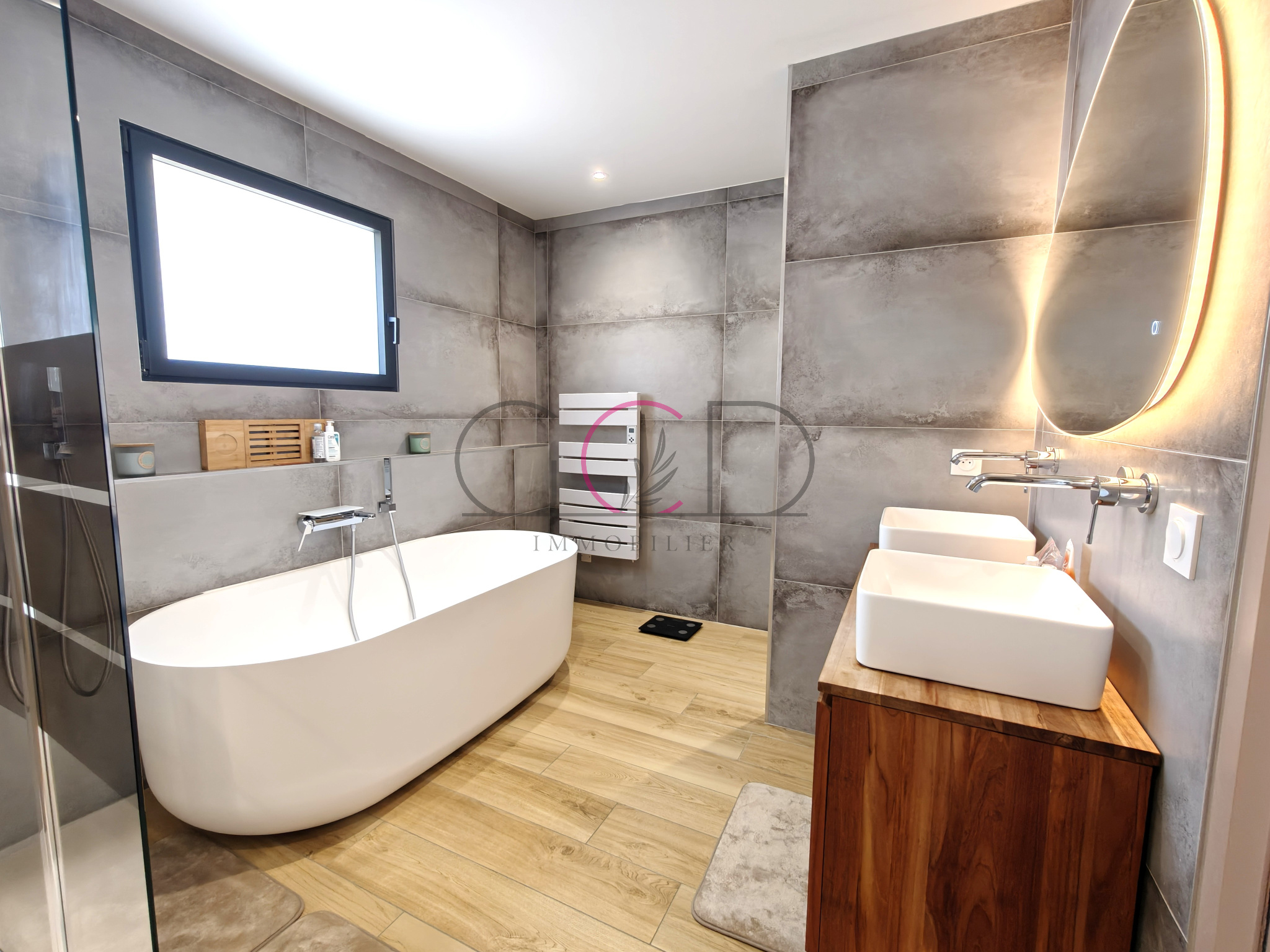 À l’étage, l’espace nuit offre de beaux volumes avec une seconde suite disposant de sa salle d’eau et d’un accès à un toit-terrasse, deux chambres confortables, ainsi qu’une salle de bains très spacieuse et complète avec baignoire et douche. Un espace multimédia en mezzanine avec plancher en verre vient compléter cet étage avec originalité.