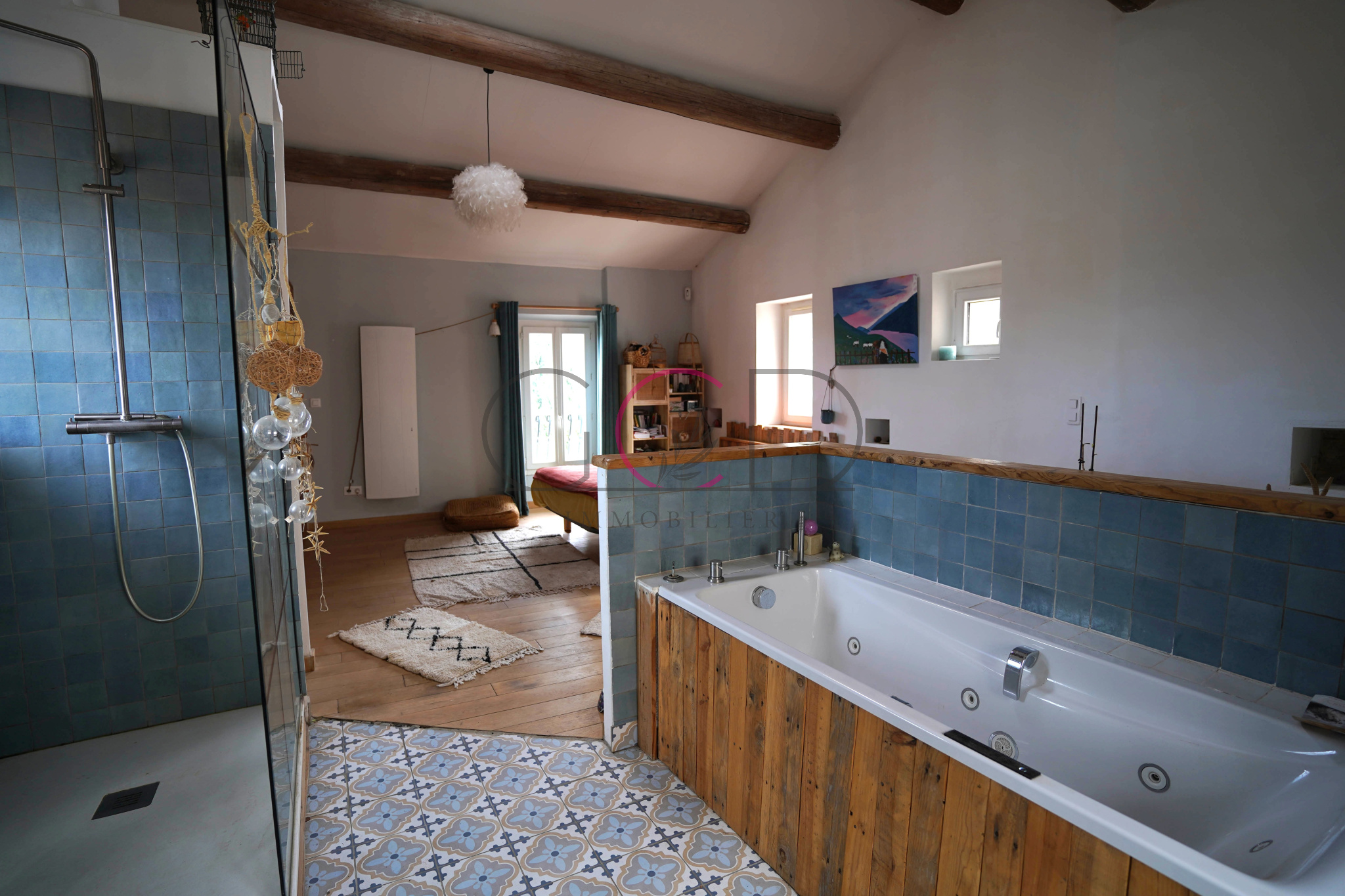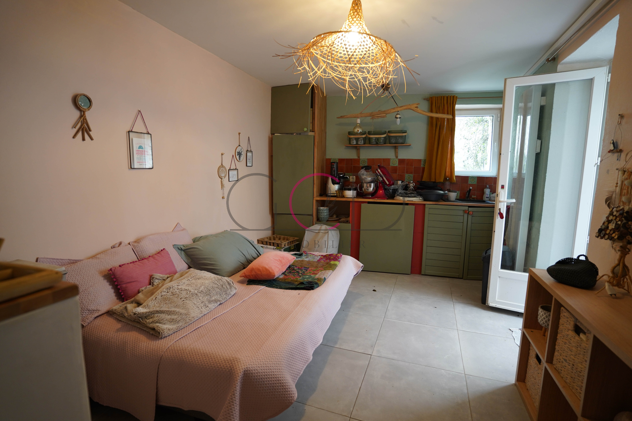 La maison principale développe environ 90 m² habitables environ sur trois niveaux. En sous-sol, une superbe pièce voûtée en pierres de 24 m² environ accueille une salle de bain, offrant un espace atypique et plein de caractère, idéal en chambre d’appoint, salle de détente ou bureau, avec accès direct sur la rue et par un escalier à l'intérieur de la maison. À l’étage intermédiaire, la pièce de vie de 33 m² environ avec cuisine parfaitement aménagée et ouverte constitue un espace convivial et lumineux, mais également chaleureux avec sa vue sur la Sainte-Victoire et son poêle à bois. Le dernier niveau est dédié à une suite spacieuse de 33 m² environ, avec salle de bain ouverte, créant une atmosphère intime et chaleureuse, où on retrouve toujours une vue sur la Sainte-Victoire confortablement installé dans son lit.