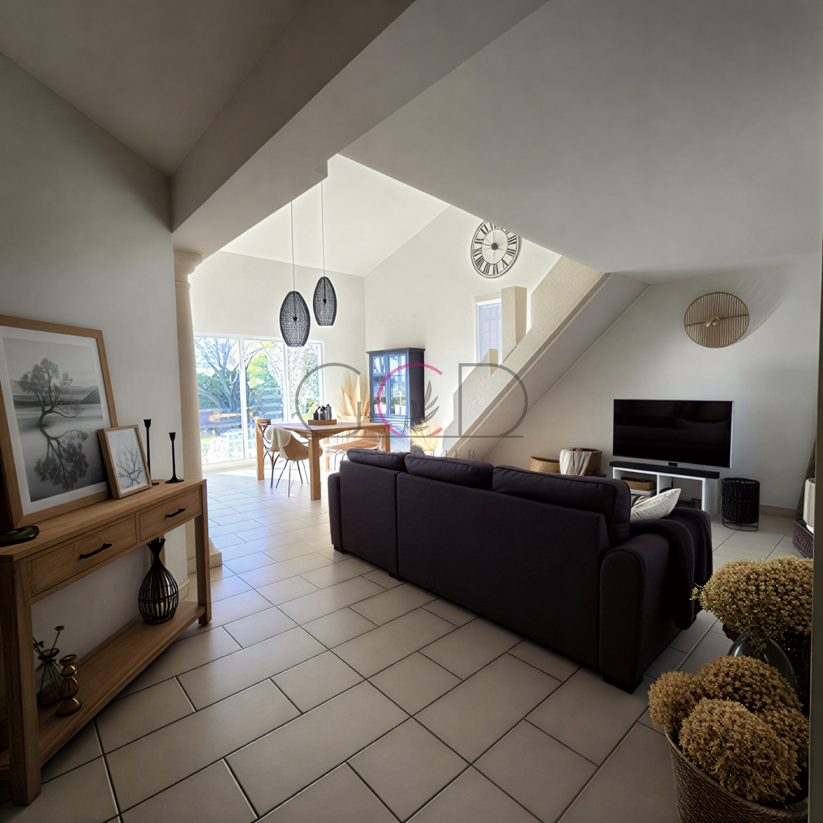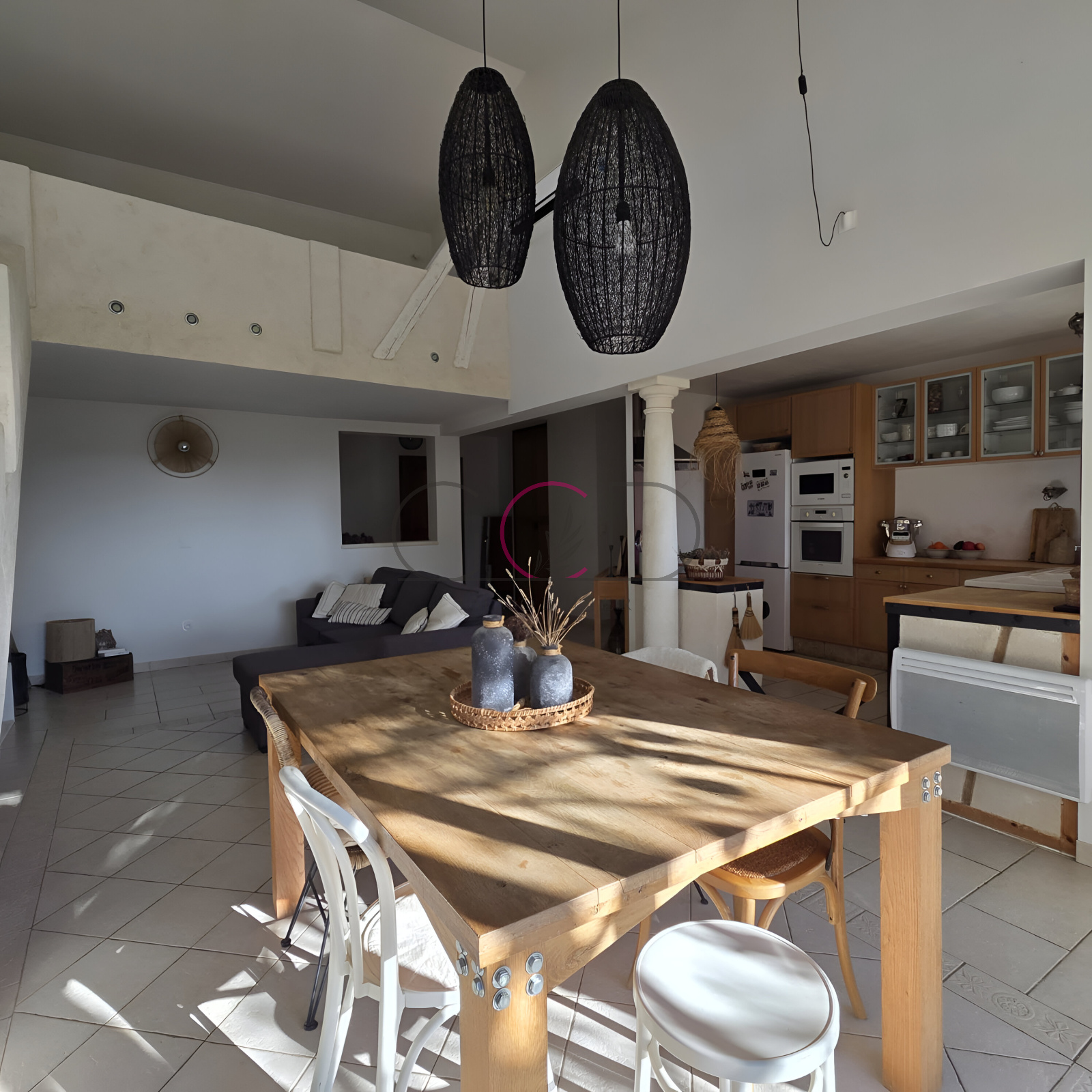 Le coeur de la villa s'organise autour d'un vaste séjour de 48m² avec cuisine semi-ouverte, mis en valeur par une belle hauteur sous plafond et une mezzanine, qui structure l'espace tout en renforçant la sensation d'ouverture et de perspective.